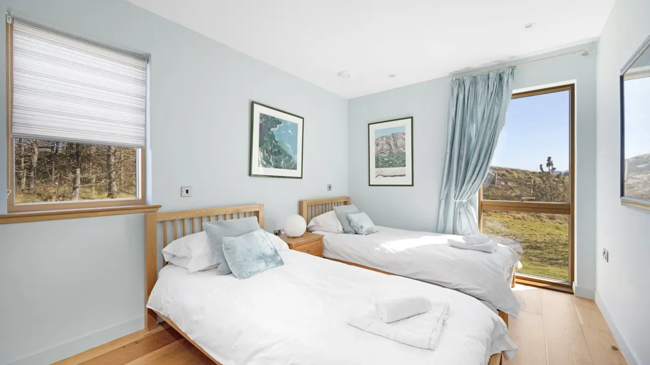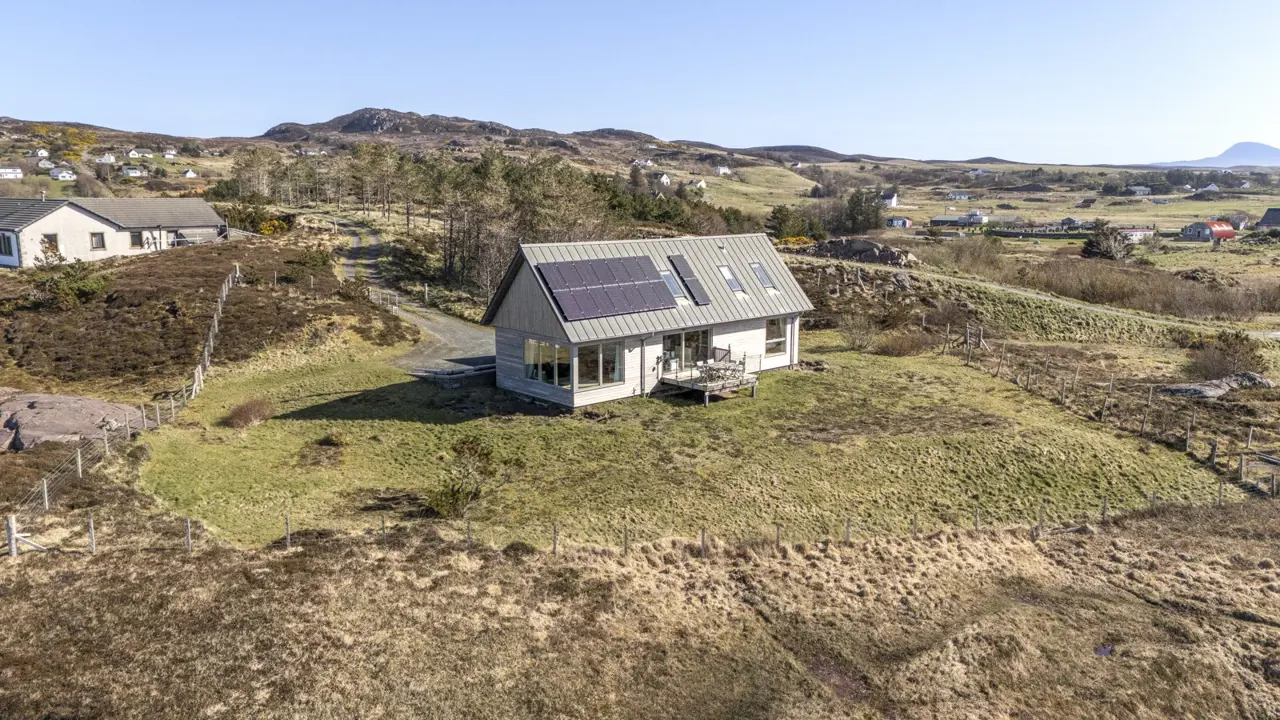 Boom House is in a beautiful setting on the northeast side of Loch Ewe in the scattered crofting village of Mellon Charles. The nearby village of Aultbea lies on the west shore of the loch and has a good range of amenities including a village shop, doctor’s surgery, garage and hotel and bar. There is a primary school at Bualnaluib, 1.5 miles from Mellon Charles, and secondary schooling is in Gairloch about 15 miles away and for which there is a free bus service. Further shops and amenities are available in Poolewe, Gairloch, Ullapool and Dingwall, with Inverness some 78 miles distant having all the facilities of a major city, including its airport with regular flights to the south and Europe.Boom House, designed by architect Robin Haddow, was completed in 2013 and has been under the same ownership since new. An energy efficient property with high levels of insulation, an air source heat pump, a mechanical ventilation with heat recovery system (MVHR), solar panels with a feed-in-tariff, and with an abundance of glazing maximising solar gain. Boom House has many contemporary design elements include larch cladding, steel roofing, a corner window and a mezzanine with glass balustrade mirroring the glass balustrade surrounding the external raised timber deck accessed by a glazed sliding door, ensuring uninterrupted views from the kitchen. The kitchen has integral appliances, a work island/breakfast bar and is open plan with the dining /sitting area with its vaulted ceiling, wood burning stove, and large windows which flood the space with costal light and take full advantage of the views over Loch Ewe and beyond. Loch Ewe has an interesting history, and the name ‘Boom House’ is a nod to the boom net which was run across the entrance of Loch Ewe in World War II to protect the naval fleet on the sea loch from German submarines.