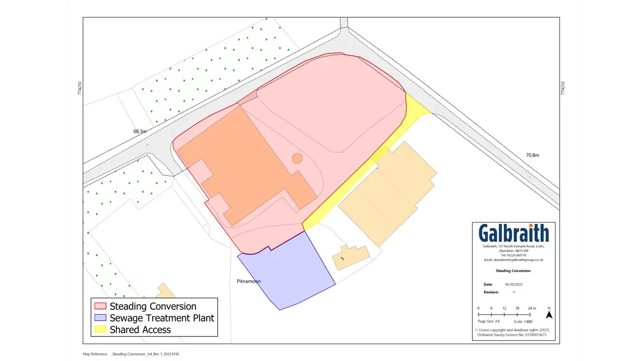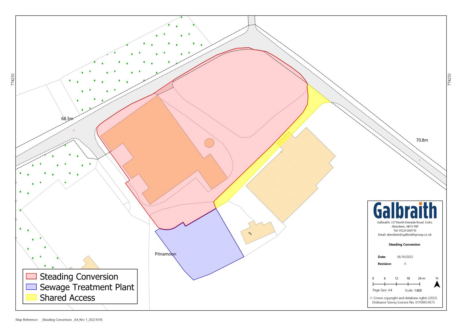 This is a rare and exciting opportunity to obtain a large development site in the heart of the rolling Aberdeenshire countryside extending in total to around 1.5 acres. This fairly level site enjoys attractive views and has the benefit of full, and purified, planning permission for conversion and will give the developer an opportunity to create an exclusive housing development in a stunning setting. The breakdown of the 6 dwellings are as follows:-House No. Size 1 166m2 2 221m2 3 198m2 4 134m2 5 121m2 6 159m2 Each property would benefit from a single garage and exclusive garden grounds. PLANNINGFull Planning permission for the conversion of steading to form 6 dwellings was granted by Aberdeenshire Council on 21st October 2014 and subsequently purified in 2017. Details of the planning permission are available on the Aberdeenshire Council planning portal website under the reference APP/2013/3558.SERVICESWe understand that mains water and electricity are located adjacent to the site. There is a recently completed sewage treatment plant close by, for which any purchaser / developer can utilise. It’s the responsibility of interested parties to investigate the availability and cost of utility services to the individual site and capacities thereof.VIEWINGSStrictly by appointment with the Selling Agents. Viewing appointments will be arranged subject to Government legislation regarding COVID-19 and social distancing measures will be adhered to at all times.The steading building is a redundant agricultural building. Should interested parties attend the site and enter the steading unaccompanied and/or without prior appointment then they do so at their own risk and safety precautions should be taken.