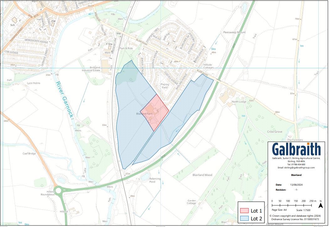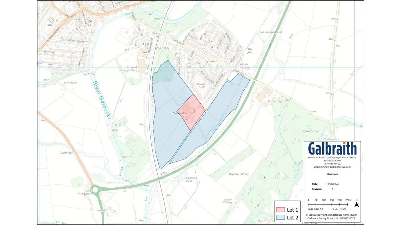 LOCATIONDalry is a historic conservation town located approximately 25 miles to the south-west of Glasgow and 9 miles to the north of Irvine. The town benefits from excellent communication links via the A737 leading to Irvine 9 miles to the south and Glasgow Airport 17 miles to the north-east, where it joins the M8 motorway leading to Glasgow and Edinburgh. The town benefits from a newly completed bypass and Dalry Train Station is located immediately to the west of the subjects and provides frequent services to Glasgow Central Station (27 minutes) and Ayr (26 minutes) enabling an excellent opportunity for commuters. The town benefits good local amenities including bank, supermarkets and a wide range of shops. There are two primary schools and secondary schooling is available at nearby Garnock Academy in Kilbirnie, which has recently been redevelopment, and St Matthew’s Academy in Saltcoats. Dalry is a popular and growing town with an active and thriving local community engaged in a range of activities and has a population of circa 5,250 (2022) and a population of 51,619 within a 5-mile radius.DESCRIPTIONThe site is located to the south-east side of Dalry and extends to approximately 18.73 hectares (46.28 acres). The site is generally orientated north to south and comprises undulating farmland currently down to grass. An indicative concept masterplan has been prepared and shows a mixture of residential housing, community areas, and public open space. The site is bounded to the north by existing housing to the west by the railway and, to east by rolling farmland. The Dalry bypass lies immediately to the east of the site with farmland beyond. The masterplan has been designed to take advantage of the southerly and westerly aspects of the site providing the potential for views over the surrounding countryside.Blairland Farmhouse, steading and paddock are centrally located within the land and comprise a 3/4 bedroom house with 1 bedroom annex extending in total to approximately 2,800 sqft (261 sq.m). The main agricultural building lies to the north of the farmhouse and extends to approximately 33,000 sq.ft (3,072 sq.m). There is a further detached shed to the west extending to approximately 2,970 sq.ft (276 sq/m). The farmhouse is in poor condition and requires total refurbishment. The agricultural buildings are also in poor condition and may require to be replaced.PLANNINGThe site is designated within the North Ayrshire Council Local Development Plan, adopted in November 2019, as a site for residential development with an indicative capacity of up to 200 houses under ref: NA1113. It should be noted that there may be scope to increase unit numbers on site, subject to obtaining the necessary consents.Planning Permission in Principle for residential development was granted by North Ayrshire Council on 3 June 2015, reference N/15/00103/PPPM, subject to a number of conditions. There is no Section 75 agreement required and full planning documentation is contained within the Technical Information Pack.The planning applications were extended by variation to conditions in 2018 and 2021, under ref: 18/00328/PPM and 21/00214/PP and most recently in May 2024 under ref: N/24/00307/PP.Full planning information can also be obtained by entering the planning reference numbers in North Ayrshire Council’s Planning Portalhttp://www.eplanning.north-ayrshire.gov.uk/OnlinePlanning/search.do?action=simpleSERVICES AND ACCESSThere are mains supplies of water, electricity, gas, telecommunication and drainage within close proximity of the site. It is anticipated that new supplies will be required to be brought to the site. The location of existing services is available in the technical information pack together with further information relating to potential connection points. However, any intending purchasers are advised to make their own enquiries with the relevant Utility Company/Authority.It is expected that a new access road will be required for any future large-scale development which will run from Blair Road on the northeastern boundary of the development land. A private access road owned by Transport Scotland runs through the land on a north-south axis and provides access to Blairland Farmhouse, steading and land. It should be noted that there is an arrangement with Transport Scotland for the grant of rights to lay services over and through the Transport Scotland access.METHOD OF SALEThe subjects are offered for sale as a whole or in 2 Lots.Lot 1: Blairland Farmhouse, Steading and PaddockLot 2: Development LandFor the development land, a deposit of £25,000 will be paid on the conclusion of missives, the deposit will be non-refundable but deductible from the purchase price.Interested parties will be notified of a closing date and requested to submit a heads of terms offer. Galbraith will issue the required form of offer to interested parties on notification of the closing date. The form of offer will include the minimum information required and timescales.We recommend that interested parties note their interest in the site in order to be kept informed of any closing date and to receive any additional pertinent information.