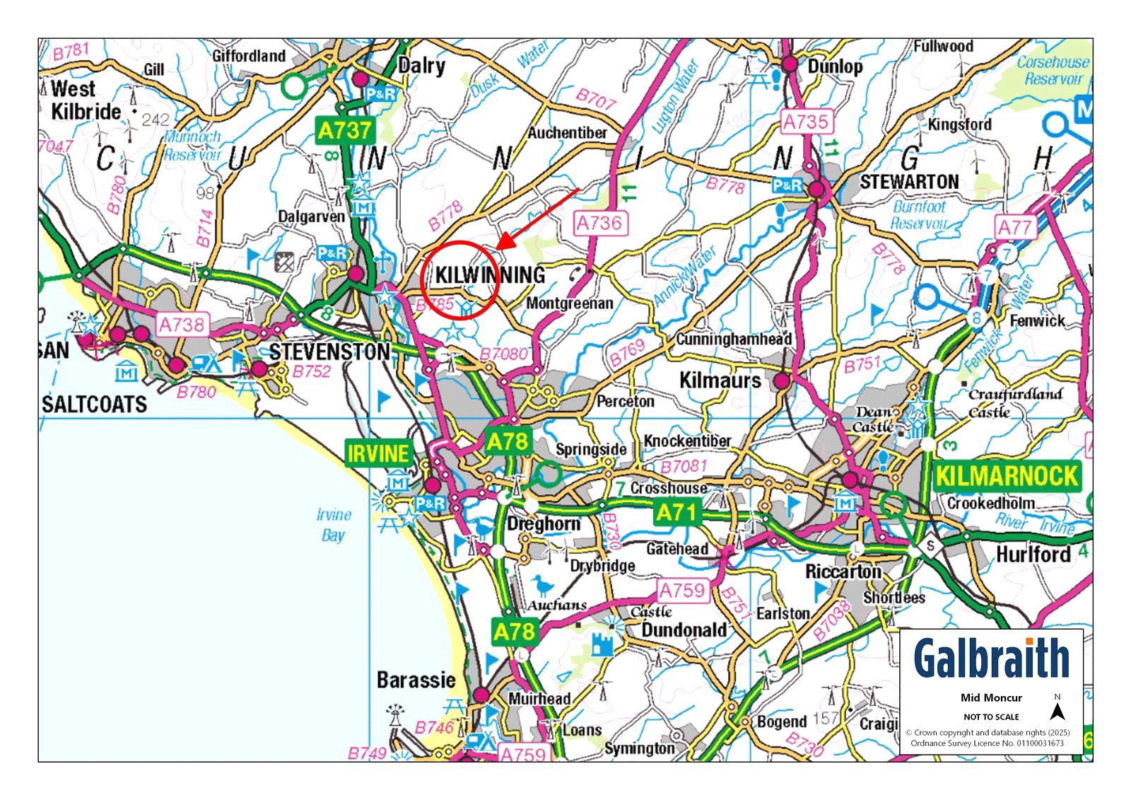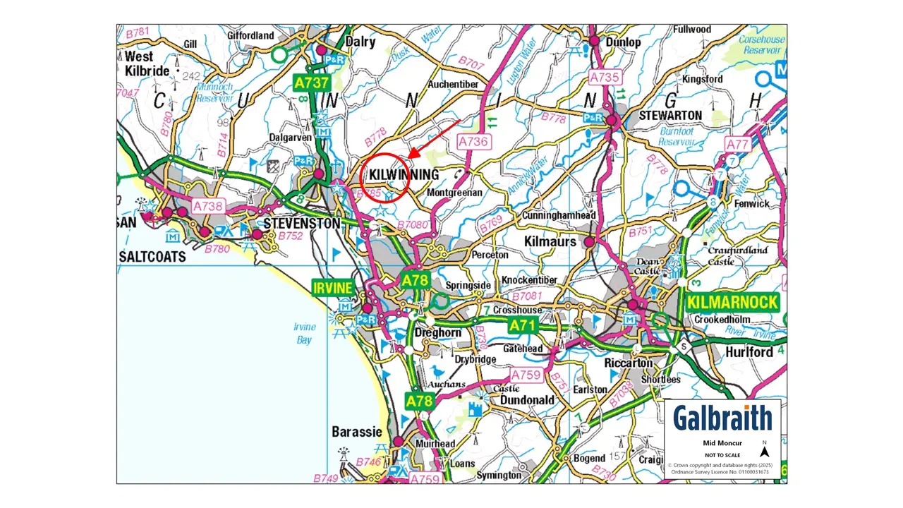 Mid Moncur is situated in a slightly elevated position close to the North Ayrshire town of Kilwinning. Locally there are an excellent range of services and facilities including primary schools and a secondary school whilst more comprehensive service and leisure facilities and retail parks are available in the nearby larger towns of Ayr, Kilmarnock and Irvine. Glasgow is easily reached via the A736 or A737 and Kilwinning also has a railway station on the main line to Glasgow with a regular train service. Glasgow and Prestwick Airports are 23 and 14 miles away respectively.The surrounding countryside is ideal for outdoor pursuits. Nearby Eglinton Country Park offers horse-riding on an extensive network of bridleways, as well as permit fishing for Eglinton Loch and the River Lugton. Ayrshire is renowned for its golf courses which include Royal Troon, Prestwick and Turnberry. Ayr Racecourse holds regular fixtures including the Ayr Gold Cup and Scottish Grand National. Sailing is popular on the Firth of Clyde with yacht marinas at Troon, Largs and Inverkip.DESCRIPTIONLot 2:Planning permission has been granted for the conversion of the existing natural stone farm buildings to create 2 attached dwellinghouses (Plots 3 and 4 on the planning drawings). Plot 3 to form a beautiful open plan kitchen/living room, separate sitting room, 4 bedrooms (one en suite), bathroom, shower room and utility room. About 154.2m2. Plot 4 – to form a spacious open plan kitchen/dining/living room, separate sitting room, 4 bedrooms (two en suite), bathroom, shower room, utility room. About 204.5m2. ACCESS/THIRD PARTY RIGHTS OF ACCESS/ SERVITUDES ETCThe farmhouse and Plots 3,4 and 5 will have joint ownership and maintenance of the access drive (hatched black on the plan).
