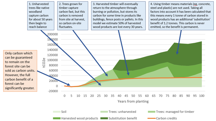 - Carbon credits do not include the benefit of carbon stored in wood harvested from the forest, or substitution of wood products for carbon-emitting alternatives. Although this wood may still deliver significant carbon benefit, it is no longer the woodland owner’s property so cannot be traded by them. We note these under the extra, ‘non-accredited’ benefits.