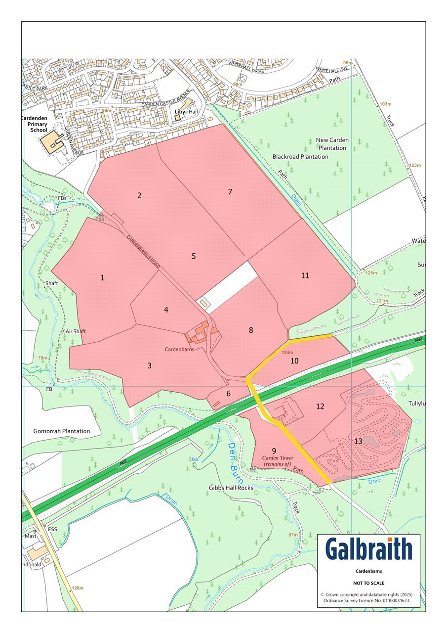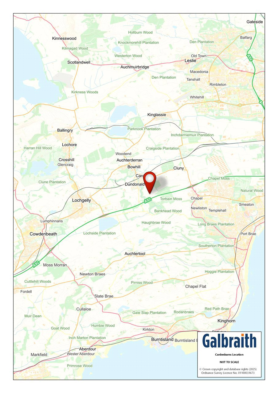 SITUATION Cardenbarns Farm is situated in a rural location in the County of Fife. It is located a short distance from Cardenden, a town located on the south bank of the River Ore in the parish of Auchterderran, Fife. It is equipped with day to day facilities including shops, pharmacy, two primary schools, library, train station, cafes and restaurants. Kirkaldy, 5 miles southeast, and Dunfermline, 11 miles southwest are both equipped with a greater range of services including supermarkets, international retailers, primary and secondary schooling, and both bus and train stations. Cardenbarns Farm is conveniently located close to the A92 dual carriageway providing excellent transport networks. Edinburgh with its vibrant city amenities and international airport is less than an hour’s drive south. DESCRIPTION Cardenbarns Farm comprises an attractive 3-bedroom farmhouse which lies adjacent to a range of traditional farm buildings, surrounded by approximately 151.55 acres (61.33 hectares) of arable and pasture ground. METHOD OF SALECardenbarns Farm is offered for sale as a whole. Cardenbarns FarmhouseCardenbarns Farm Farmhouse is a harled property under a tiled roof with double glazing throughout enjoying a southerly aspect. The farmhouse connects into the workshop forming part of the steading and offers accommodation over two floors.The accommodation over two floors comprises:Ground Floor: Hall, Office, Breakfasting Kitchen, Sitting Room, Double Bedroom. Utility bedroom.First Floor: 2 Double Bedrooms, Family Bathroom. The garden lies to the front of the property and is primarily laid to lawn. Farm BuildingsCardenbarns Farm is equipped with a traditional steading (incorporating the farmhouse) and some more modern farm buildings, some of which are in need to repair and upgrading. The buildings lie adjacent to the farmhouse with a sizeable yard area. The Land Cardenbarns Farm extends to approximately 151 acres (61 ha) and is a ring-fenced unit lying to the north and south of the A92 dual carriageway with a farm track leading directly to the farmhouse and steading. The land is principally classified as Grade 3.1 and 3.2 with some area of Grade 5.1 by the James Hutton Institute. The land is relatively flat rising from approximately 102m to 130m above sea level at its highest point. The fields are of a good practical size, predominantly enclosed by stock fencing and are mainly accessed via the internal farm track with further excellent field-to-field accesses.The area of land to the south of the A92 is former open cast mining and is now utilised as a motorcross track with a radio controlled car circuit. The current passing rent is for the motocross club if circa £6,500 pa and the current passing rent for the remote control car business is £500.IACSAll the farmland is registered for IACS purposes and the farm code is 403/0009.THE BUNGALOWSituated on the north side of the access track is a separate bungalow called Morlands, which is being retained by the vendor along with an area of ground extending to circa 2.5 acres. The necessary rights of access and services will be reserved to Morlands on settlement.ACCESS ROADCardenbarns Farm has a right of access over the track, which connects to the north into Cardenden. Alternatively, the farm can be accessed to the south (with a flyover over the A92), which leads to Torbain Road; this section is more suitable for lorries and larger machinery. Ownership is split between different owners. There is a right of way for public pedestrian access along the entirety of this road. The flyover is owned and maintained by BEAR Scotland.CLAWBACK PROVISIONCardenbarns Farm shall be sold subject to a 20 year clawback provision in favour of the seller should planning permission be granted for the development on any part.