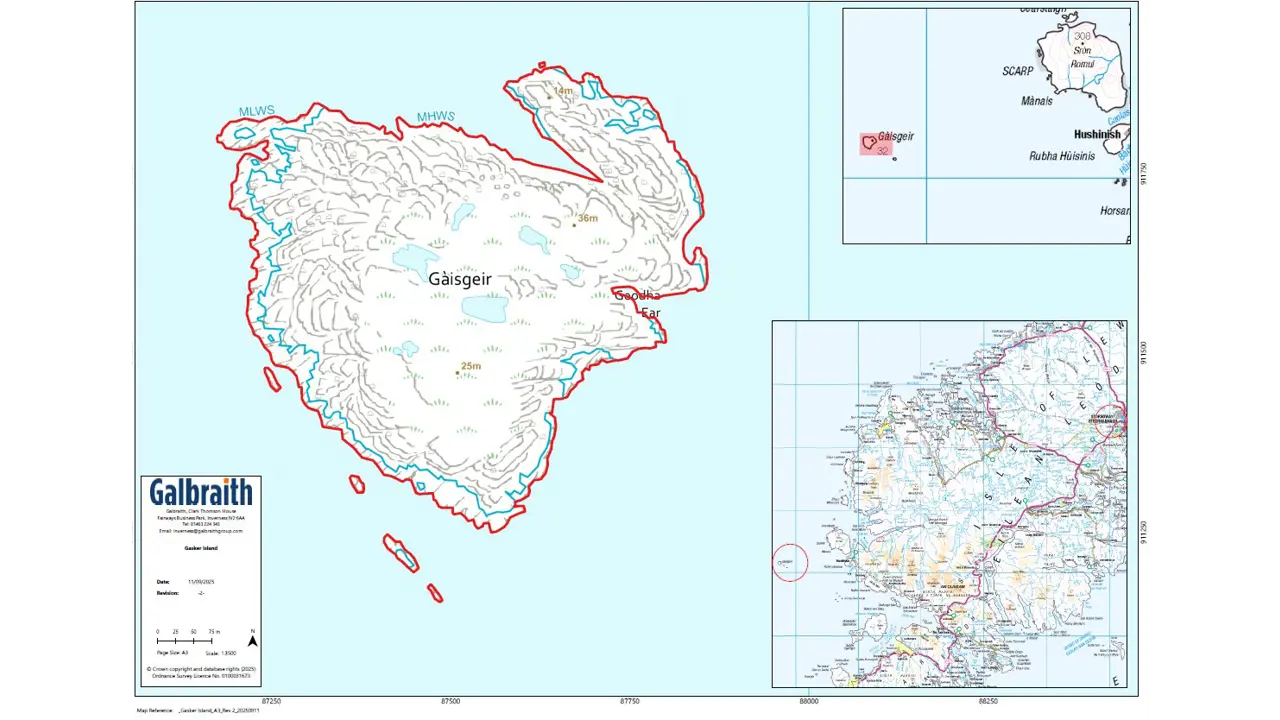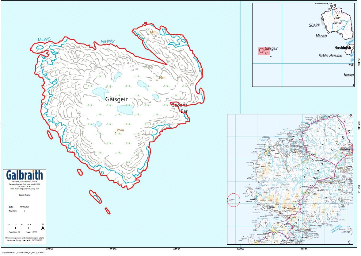 Gasker Island (or GÃ isgeir in Gaelic) is located in the Outer Hebrides, lying to the west of the Isle of Scarp and the South Harris Mainland, and to the north west of the Isle of Taransay.Gasker is a stunning uninhabited island extending to approximately 65.6 acres in total, with some additional outcrops including Gasker Beag adding a further 5.5 acres. The island has a rugged and rocky coastline, and above this lies an area of fairly rich and fertile grassland with a number of freshwater lochans.The island includes a number of small outcrops, the most notable being Gasker Beag, which lies to the south east of Gasker.Gasker is known for its grey seal breeding colony. Historically residents of Scarp island visited Gasker to hunt for seals. The island is desginated within the Small Seal Islands SSSI for this species.A small un-manned lighthouse is located on the island, the site of which is owned by the Northern Lighthouse Board, who visit periodically for maintenance.There are no moorings currently installed on the island. There are two sheltered bays on the island where it is possible to land a small craft (tide conditions dependent) located at Geo Iar on the north side or Geodha Ear on the south side.There are no buildings or structures on the island currently (apart from the lighthouse), nor are there any service connections. It may be possible to construct a small cabin or hut on the island, subject to consent.