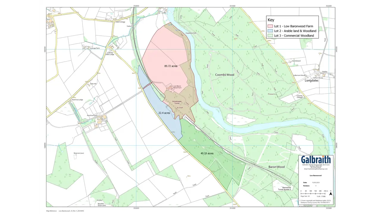 The PropertyFor sale as a whole or in any combination of 3 individual lots.The PropertyLow Baronwood Farm is set in a beautiful location in the heart of the iconic Eden Valley and provides all the charm of rural life whilst being only a short distance from the excellent range of local amenities within the village of Armathwaite, 4 miles from Lazonby and 11 miles from the busy market town of Penrith. Nearby transport connections include the M6 and A6, and trains from Carlisle and Penrith direct to London Euston.The houses are situated at the end of a long sweeping drive over the original railway bridge and ending in an extensive gravelled parking area. The property is surrounded by rolling fields and open countryside with magnificent unspoiled views and benefits from a high degree of privacy. There are no public rights of way across the property. The main house occupies a commanding position leading down to the banks of the River Eden. It was converted from a range of traditional buildings in 2007 by the current sellers. It is an uncommonly well-presented house with a flexible flow of accommodation which works well as a cosy and comfortable family home with a luxurious principal bedroom suite with more striking reception rooms making it equally well equipped for entertaining. There are various well organised and invaluable outbuildings which have historically been used for the storage of farming equipment.The Old Farmhouse is across the courtyard. It is a detached red brick building with three bedrooms and two reception rooms. It needs repair and modernisation and could work well for those who would like an additional income stream. It is restricted in planning terms to holiday accommodation.Lot 1 of Low Baronwood Farm forms the main part of a productive residential farm extending to about 89.72acres (36.30 Ha) and includes a good mix of arable, pasture and woodland parcels along the riverbank. The main access is by the private drive from the public highway although a right of access to Lot 1 for agricultural machinery will be reserved across Lot 2.Lot 2 is a parcel of about 22.4 acres (9.06 Ha) of good grade 3 arable land ideal for arable cropping. There is easy access from the public highway. Water is by a natural supply.Lot 3 is an appealing block of about 52.97 acres (21.43 Ha) of productive woodland. The woodlands at Baronwood are located on the bank of the River Eden which forms part of the River Eden Special Area of Conservation and also forms part of the River Eden and Tributaries SSSI. There is also another small area of SSSI (Eden Gorge) to the southeast of the woods. The trees are growing in gently to moderately steep ground with some areas of very steep ground. Most of the land has been worked by forestry machinery. The aspect is northerly. Soils are generally fertile and support a range of productive conifer as well as mixed broadleaf crops. The soft wood elements have been regularly thinned and there remains a good amount of timber to be harvested in the next five to ten years. The main section of commercial trees has a well-formed forest road with direct access from the public road and has been regularly used for timber extraction. There are currently no forest felling licences in place and no outstanding grant scheme obligations. The broadleaf elements are principally amenity although good quantities of biomass will be available in the future.The neighbouring estate has a right of access, though the sellers are not aware of this being exercised. The boundaries against the railway are maintained by the railway. The boundary with the neighbouring woodland owner to the south-east is not fenced. Where the woodland meets with the public highway, the drystone wall has been maintained by the seller.DirectionsFrom Carlisle, head south on the A6 and turn left for Armathwaite at the south end of High Hesket village. Take a right turn after about two miles and the drive to Low Baronwood is on the left.Postcode: CA4 9TWWhat 3 Wordsfend.knocking.mastsMileagesArmathwaite 1 mile | Carlisle 12.5 miles (London Euston 3hrs 22min) | Penrith 11.3 miles | Keswick 28.5 milesGeneralServices: Low Baronwood Mains electricity, Septic tank drainage, Private water supply, oil fired central heating. EPC: Rated C | Council Tax: Band GOld Farmhouse Septic tank drainage, Private water supply and mains electric. EPC: Rated G | Council Tax: Band ELocal Authority: Eden District CouncilTenure: FreeholdViewingStrictly by appointment with Galbraith Hexham Tel: 01434 693693Email: hexham@galbraithgroup.comANTI MONEY LAUNDERING (AML) REGULATIONS Please note that under the 2017 AML regulations we are legally required to carry out money laundering checks against purchasers. To enable us to complete these checks purchasers will need to provide along with their offer either: a) originals of primary (e.g., a passport) and secondary (e.g., current council tax or Utility bill) or b) copies of the same certified and dated by appropriate professional. Failure to provide this information may result in an offer not being considered.IMPORTANT NOTES1. These particulars are intended to give a fair and overall description of the property. If any points are relevant to your interest, please ask for further information prior to viewing. Prospective purchasers are advised to seek their own professional advice. 2 Areas, measurements and distances are given as a guide. Photographs depictonly certain parts of the property. Nothing within the particulars shall be deemed to be a statement as to the structural condition, nor the working order of services and appliances. 3 The Seller will not be obliged to accept the highest, or indeed any offer and has the right to accept an offer at any time or withdraw the property from the market. The Seller will not be liable for any costs incurred by interested parties. 4 If there are matters of particular importance please raise this with us andwe will try to check the information for you. Particu