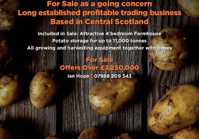 Central Scotland seed potato business with attractive 4 bedroom farmhouse, potato storage for up to 11,000 tonnes, all growing and harvesting equipment together with boxes. For Sale as a going concern.